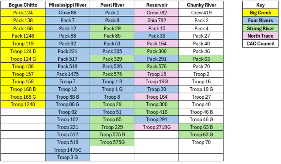 Packs and Troops in the Council are organized into Districts based on geographic areas. Effective March 2026, the Districts are: